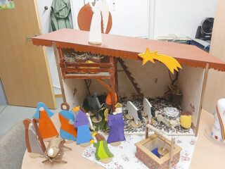 Das Team der Kita hatte den Bau einer neuen Weihnachtskrippe vor einiger Zeit beim BBZ in Auftrag gegeben. Über einen Zeitraum von einem halben Jahr haben sich die Kursteilnehmer wöchentlich getroffen, um das Projekt umzusetzen. Wir haben ihnen dabei viel kreativen Spielraum gelassen, sodass sie ihre unterschiedlichen Fähigkeiten nutzen und eine bunte und detailreich gestaltete Krippe erschaffen konnten.