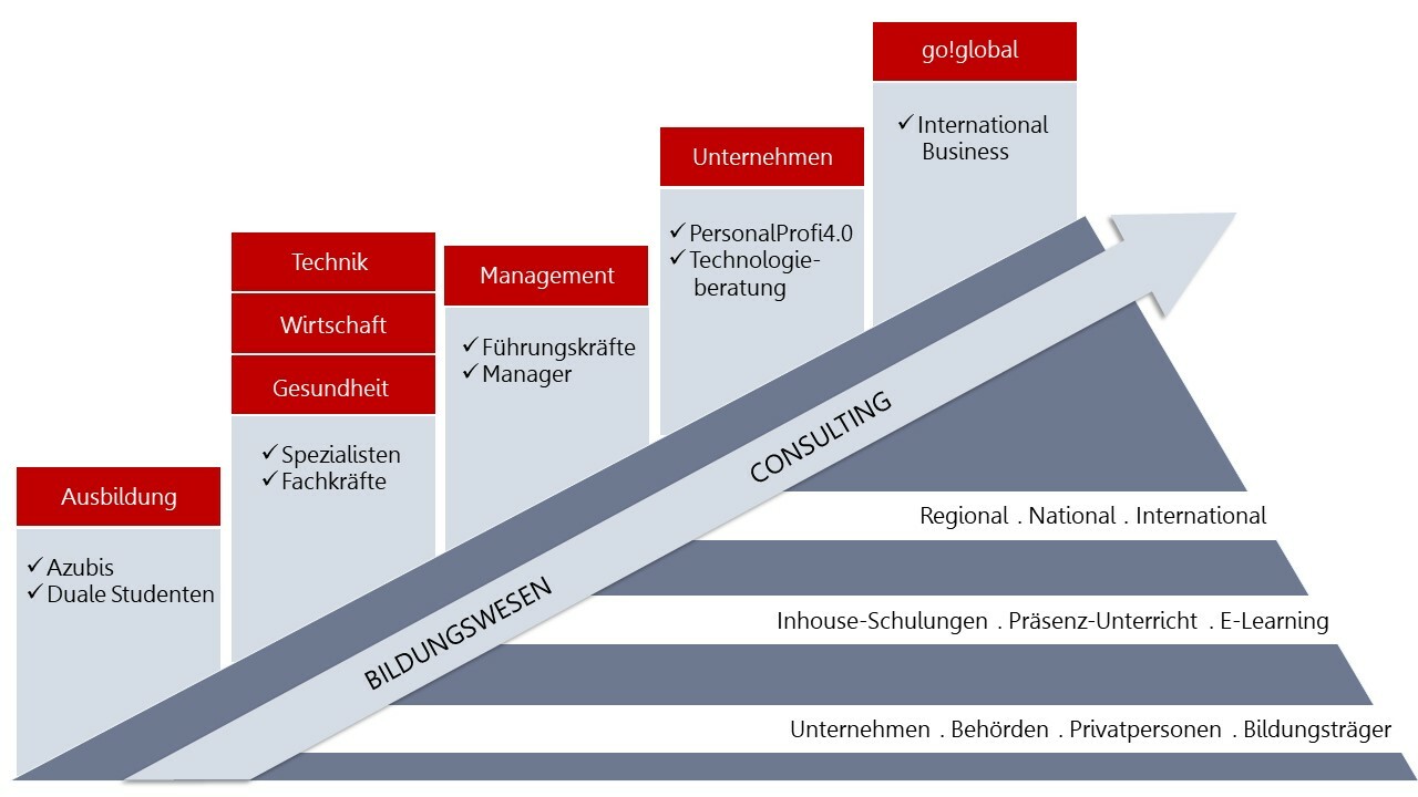 Unsere höchste, auf die Entwicklung bezogene Ebene ist die internationale Vernetzung von Personen, Unternehmen und Behörden für die internationale Zusammenarbeit mit globalen Partnern. Dabei nehmen wir Rücksicht auf unterschiedliche Lebenssituationen. Vom Präsenz-Unterricht über Fernunterricht bis zu Inhouse-Schulungen ist es jedem Interessierten möglich unsere Angebote nach Bedarf wahrzunehmen.